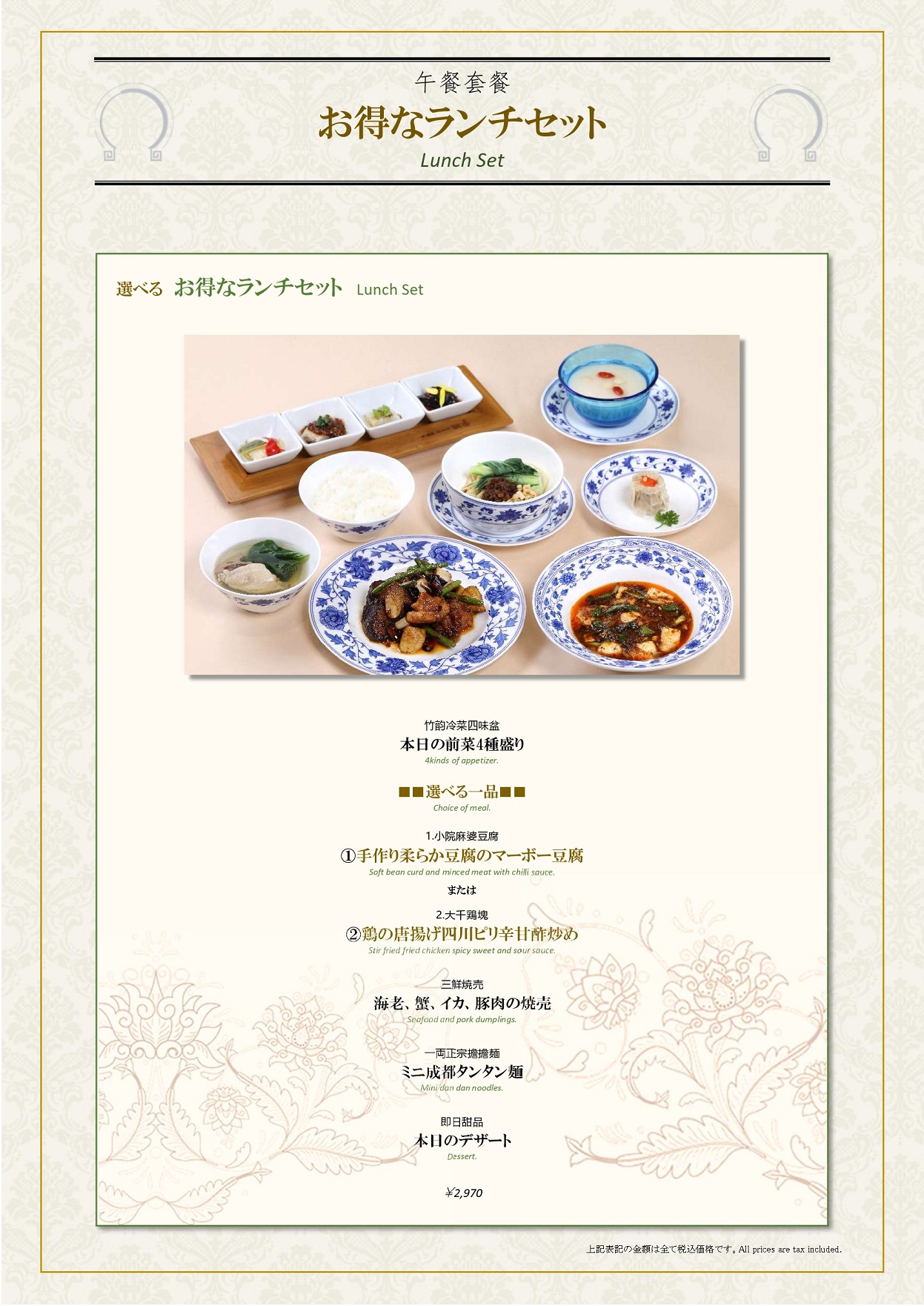 ※当店ではランチセット、ランチコース以外のメニューに税金と10%サービス料を頂戴いたします。